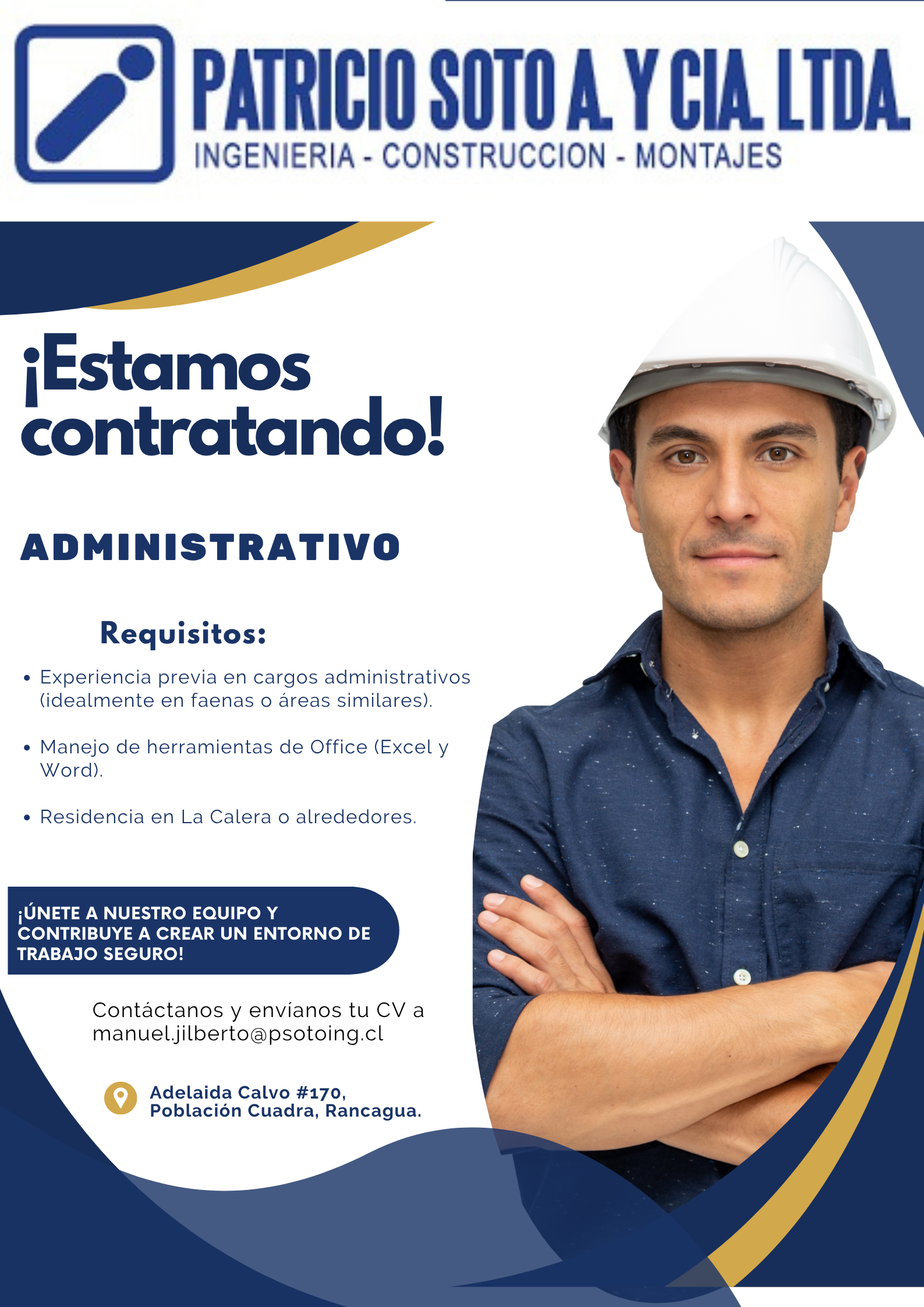 Somos una destacada empresa en el sector de proyectos de ingeniería eléctrica, montajes industriales y obras civiles. Actualmente, buscamos un(a) Administrativo(a) para unirse a nuestro equipo en la localidad de La Calera, Valparaíso.